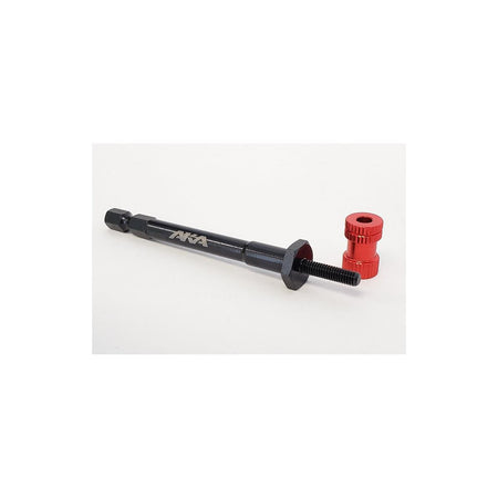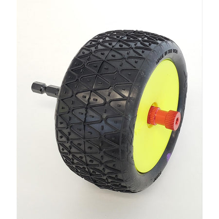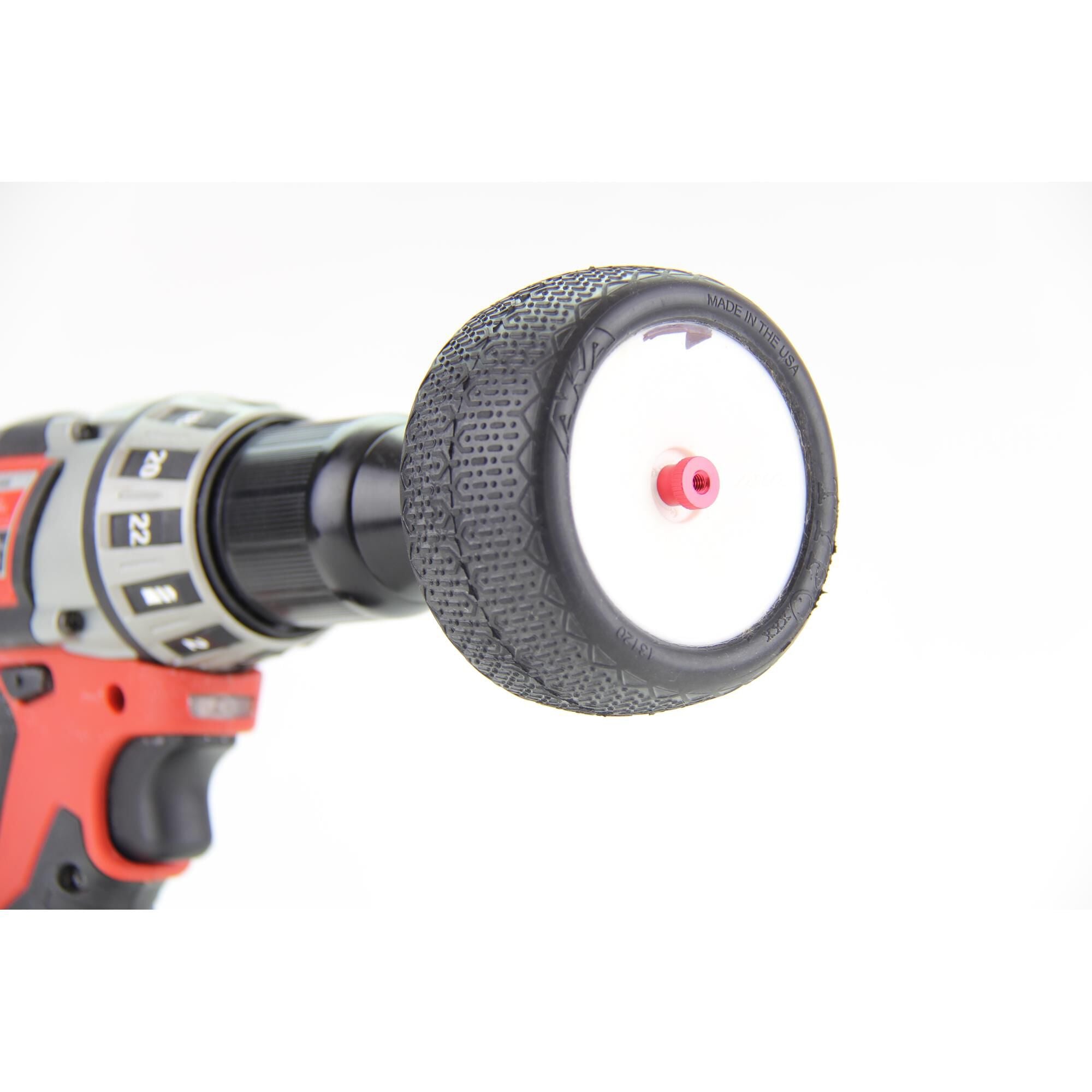 The AKA 1:10 Tire Break-In Tool makes prepping your tires for indoor racing a simple process. This Made in the USA tool is designed to fit into any standard 1/4" quick change drill. The 12mm hex fits most popular 1:10 wheels. The trick to getting peak performance from your tires when racing indoors is to get the tread height just right. Many times racers are out driving in the parking lot to speed up this process, but the Tire Break-in Tool lets you do this right at your bench. Simply chuck up the tool in your drill, mount a tire to the tool, adjust the direction of your drill to match the direction of the tire when mounted to the car and use your choice of sandpaper to get that perfect tread height you are looking for. No more running in the parking lot to burn down the tread on your tires. Package includes break-in tool, knurled nut and storage tube.