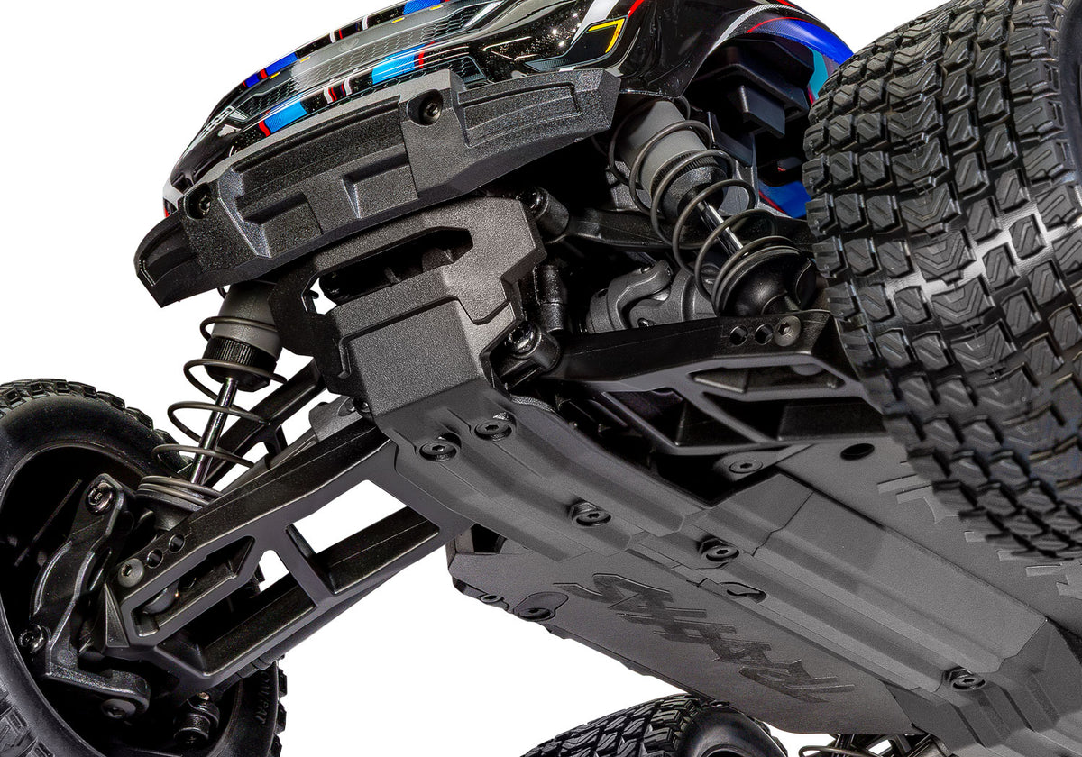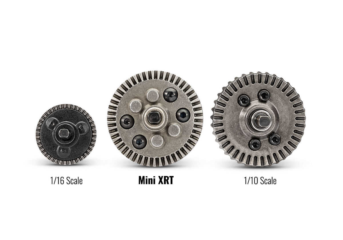Adding 3s Velineon power to a compact platform requires bold engineering. Mini XRT comes outfitted with the proven driveline components of Traxxas’ toughest 1/10 scale 4X4 trucks. Front, center, and rear steel-gear differentials, along with 32-pitch gearing and HD driveshafts, far exceed requirements for strength and long life.