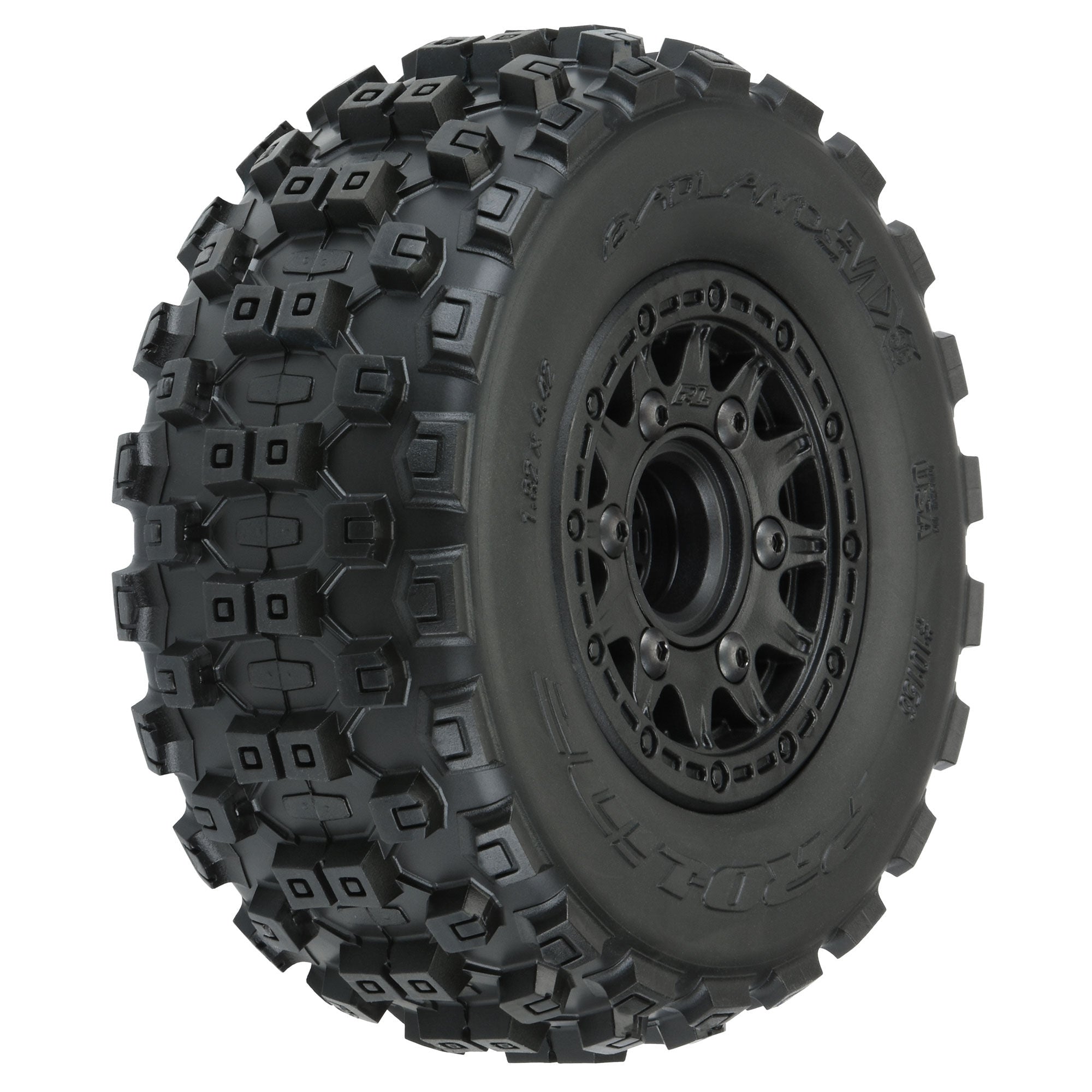 This is a pair of pre-mounted Badlands MX SC Tires on Raid Black 6x30 Removable Hex Wheels. Are you ready for the most Extreme Badlands Short Course Tires Pro-Line has ever made? Introducing the Badlands MX SC tires that have been redesigned from the ground up to chew up the dirt and spit it out in a huge spray behind your SC truck!