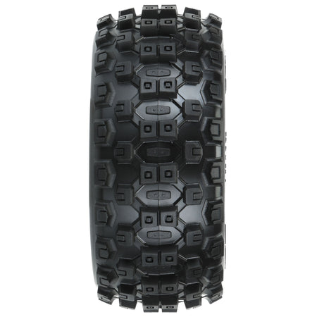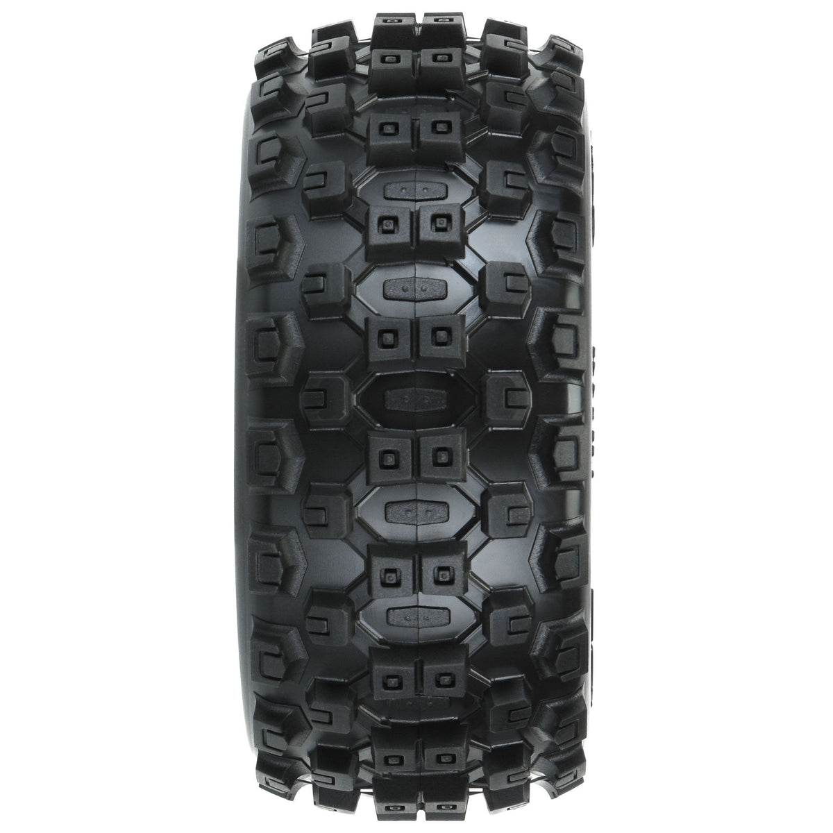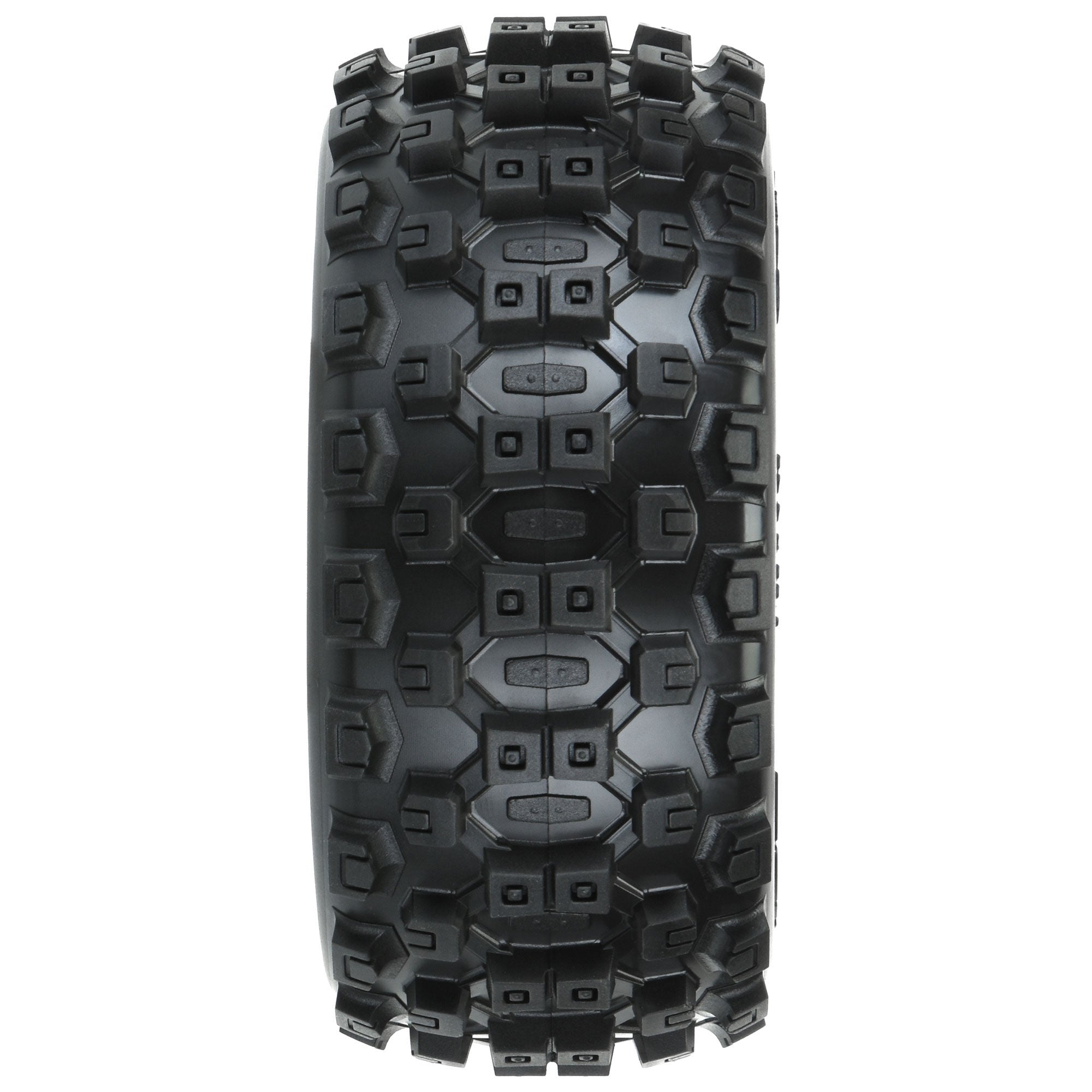 The Badlands MX SC tire uses the latest in motocross tread technology with huge, long-lasting lugs giving it the style and performance that have won over bashers across the globe. The oversized grass and dirt shredding lugs offer you the ultimate in performance under all-terrain type conditions. Compared to the previous Pro-Line Badlands tires, you can expect even better traction, improved wear resistance, and enhanced style! Made from Pro-Line's legendary soft yet durable M2 compound, the Badlands tire is poised for battle and ready to take your Short Course Truck to the next level of bashing heaven.