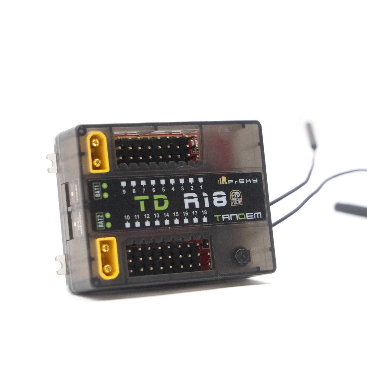 The configurable 18 channel ports are a big feature of TD R18, each channel port can be assigned as PWM, SBUS, FBUS, or S.Port. With the FBUS protocol, the Tandem series receivers can open up the possibility of seamlessly pairing with multiple telemetry devices (Neuron ESC, Advance Sensors, etc.) as well as simplifying the builds setup.