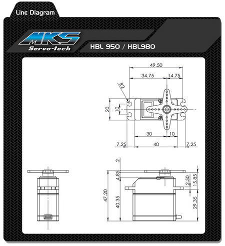 The MKS USA MHS Servo HBL960 Brushless Titanium Gear High Torque Digital Servo is a 70g HV digital brushless standard servo with metal gears and an input voltage of 6.0–8.4V. It is designed for high performance cyclic helicopter applications and features an aluminum case with a CNC milled heatsink for heat dissipation. The HBL960 has a torque of 13.6kg.cm and a speed of 0.12s/60° at 6.0V, 17.0kg.cm and 0.10s/60° at 7.4V, and 18.6kg.cm and 0.09s/60° at 8.2V. It also has a dead band of 0.0008ms, a control system of +Pulse Width Control, and a working frequency of 1520μs/333hz.