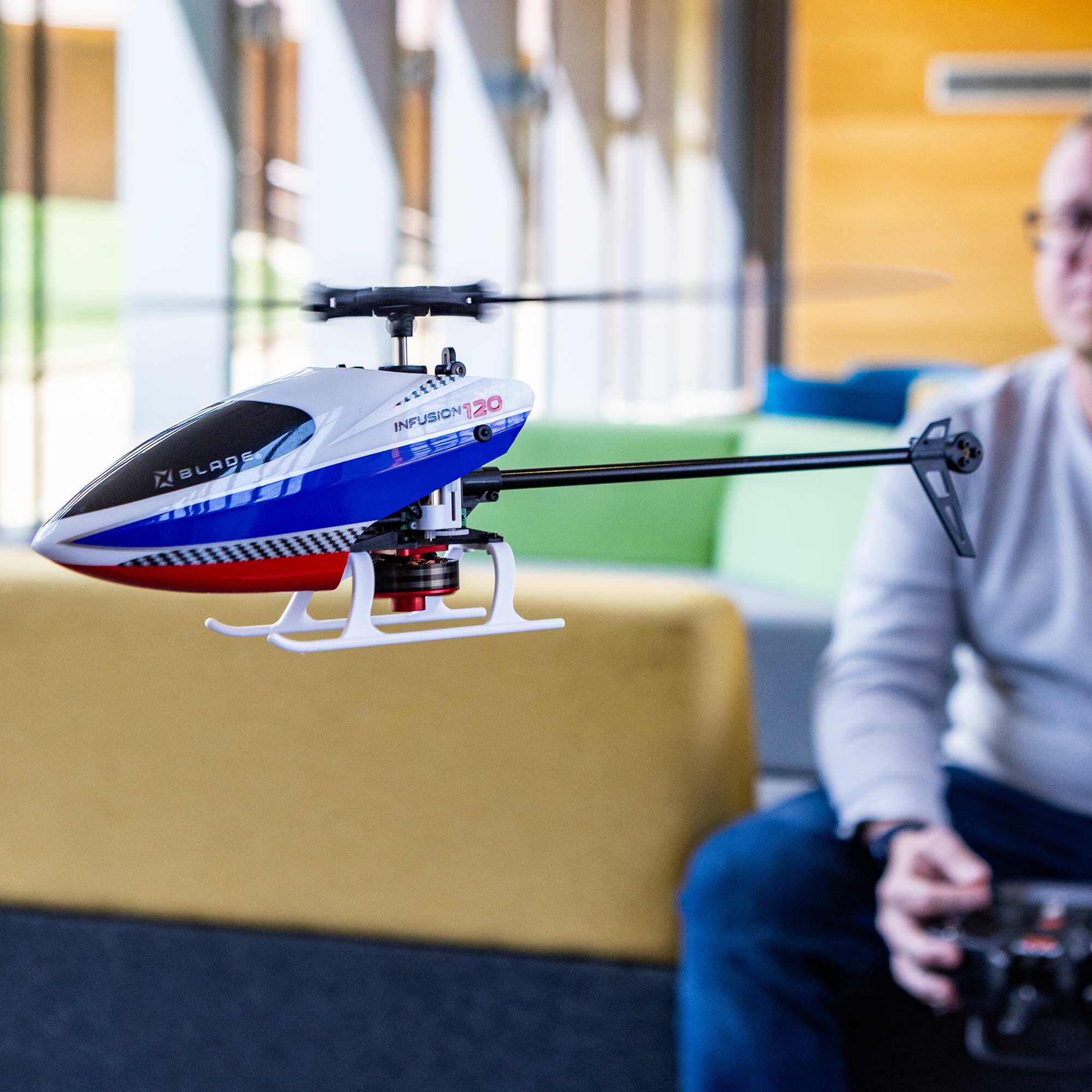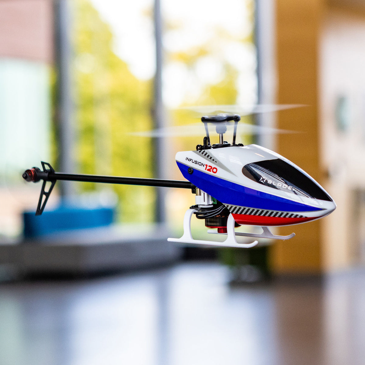 The Blade InFusion 120 helicopter features exclusive SAFE® (Sensor Assisted Flight Envelope®) technology, a revolutionary electronic flight envelope protection system that makes it easy for anyone to fly helicopters with confidence by providing flight mode versatility and Panic Recovery mode that automatically returns the heli to a level attitude.