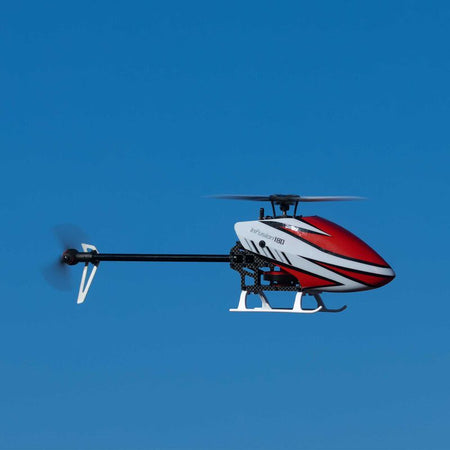 The hybrid mainframe takes rigidity to another level for a rock-solid flight experience. The carbon fiber main rotor blades feature an improved aerodynamic design with increases in efficiency and power. An oversized tail boom eliminates the need for boom supports and is crowned by an ABS plastic tail case improving vibration damping and performance.