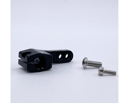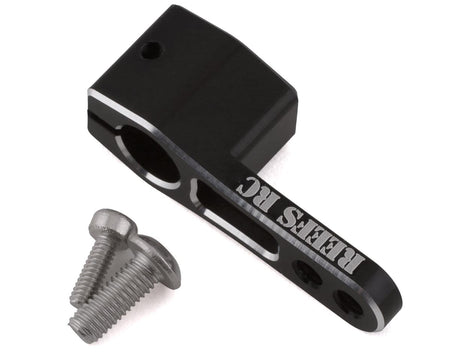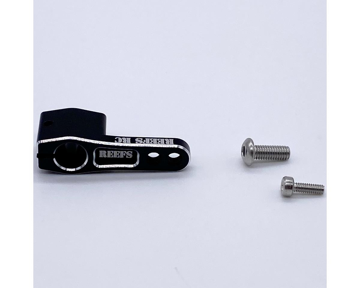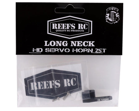 The Reefs RC Long Neck HD Servo Horn is made from hardened aluminum with a black anodized finish. This servo arm features a tall rise above the servo, two screw positions and a single screw clamp. Package includes one servo horn, two screws and a Reefs sticker.