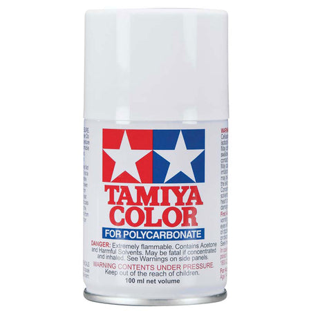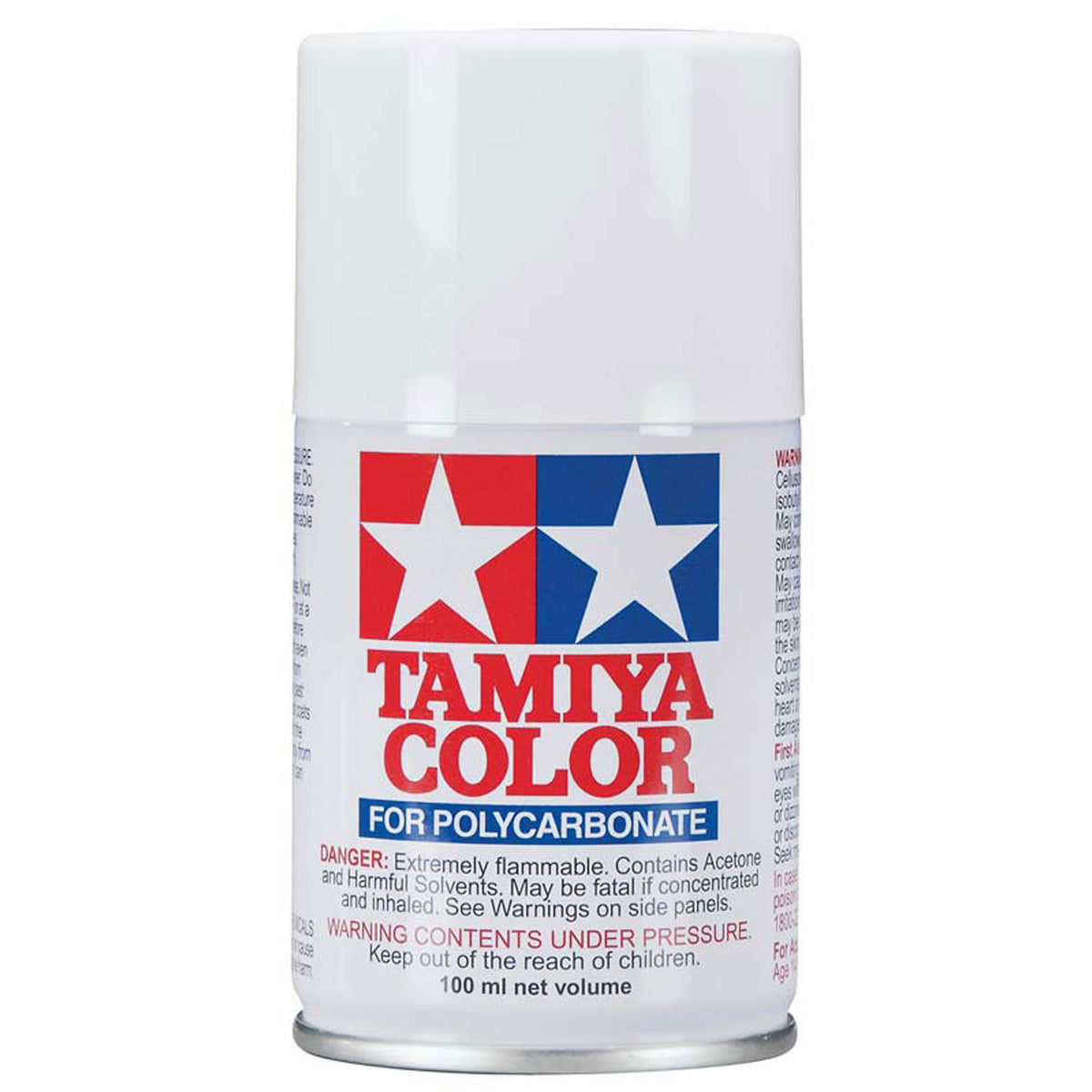 This is a 100ml can of Tamiya PS-1 White Lexan Spray Paint. These spray paints were developed especially for decorating transparent polycarbonate bodies used in R/C car modeling. Each can contains 100ml of paint, which is the appropriate amount for finishing one 1/10 scale model.
