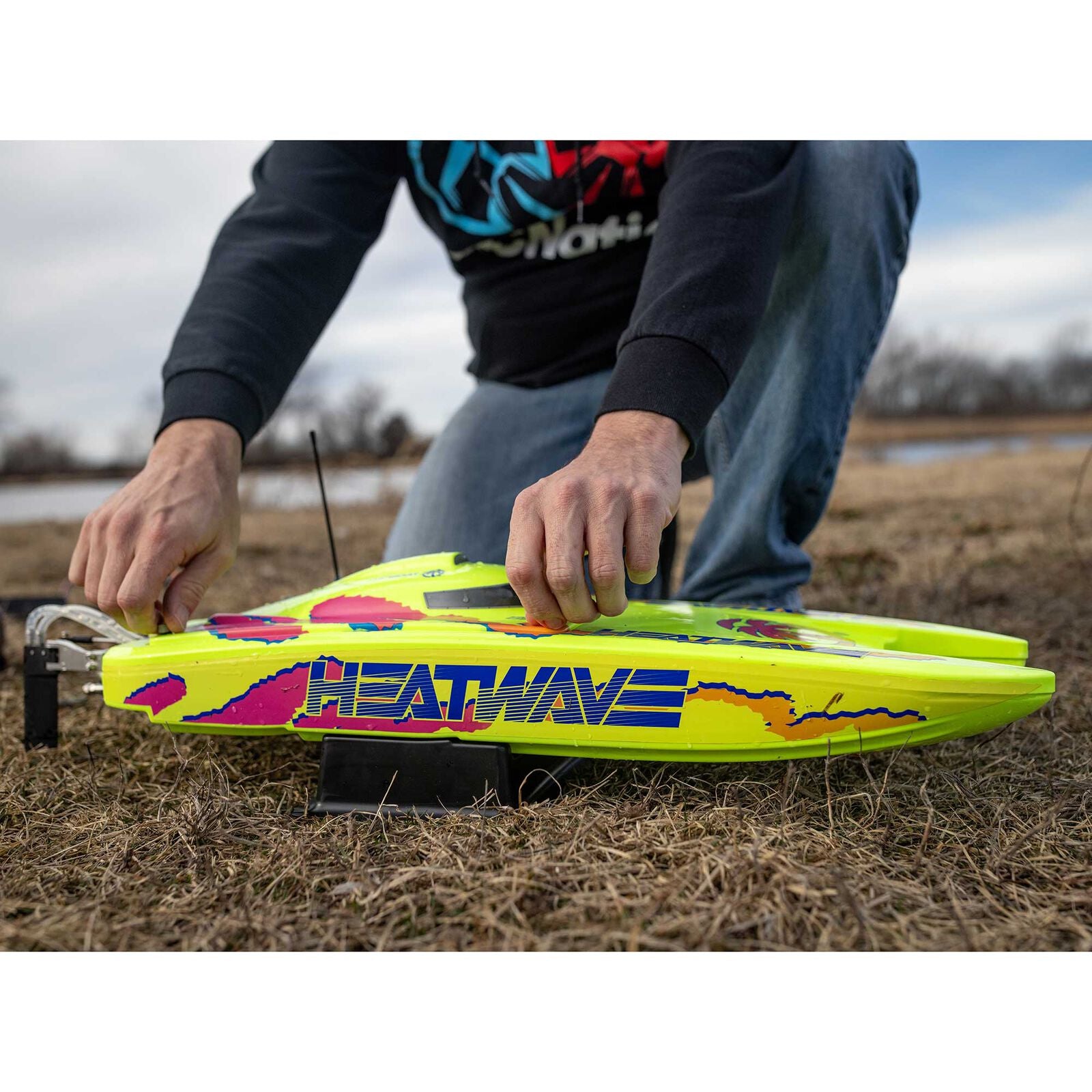 Pro Boat gives you a choice of two iconic liveries for your Blackjack 24” catamaran. At top speed, the Heat Wave race livery is a blaze of wild color burning through the water. With the Blackjack offshore racing livery option, you’ll feel like you’re winning all of the aces in a power boat Poker Run.