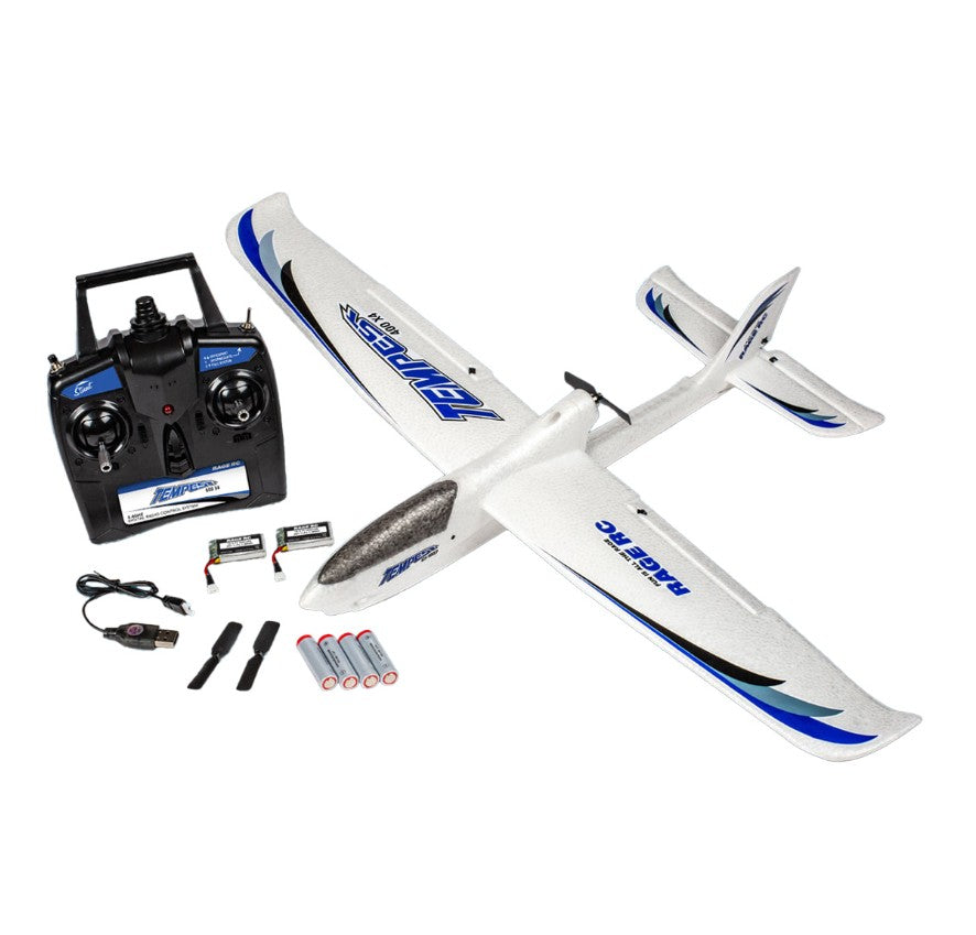 The Tempest 600 X4 features an updated brightly printed trim scheme for great visibility in the air with everything needed to start flying in the box; including a 2.4GHz standard size 4-channel transmitter, a pre-installed electronics system, a convenient USB charger, and two powerful 3.7V 400mAh LiPo batteries for extra-long flight times of up to 20 minutes. Even four AA batteries for the transmitter are included, so you'll be flying the Tempest X4 around your local park or flying field within minutes of opening the box!