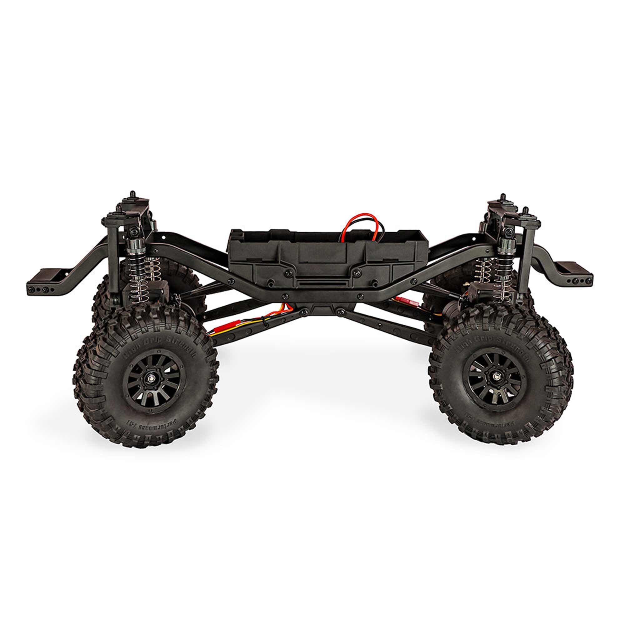 - 4WD rock crawler, 2.4GHz radio, 4-mode 4 Wheel steering, 2 steering servos, Lightweight plastic chassis, Solid axles, Motors on axles (MOA), Multi link suspension, Aluminum capped oil filled shocks.