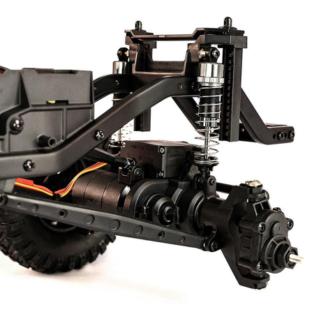 Portal axles raise the differential height relative to the wheel mounting surface, providing added ground clearance without the need for larger tires. The portal gears are durable metal and they help to reduce chassis torque twist, resulting in a more stable ride. Each axle housing features an RC380 electric motor, contributing to a low center of gravity and providing ample four-wheel drive power for conquering rough and rocky terrain.