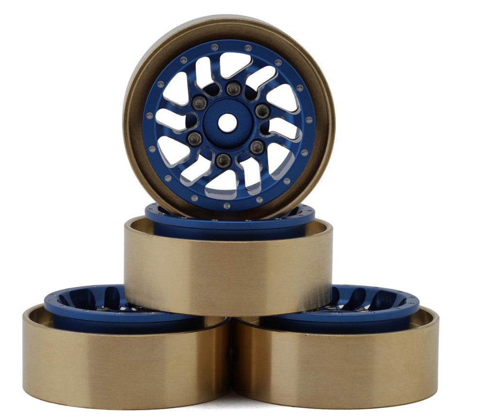 These are the Samix TRX-4M Aluminum and Brass Adjustable Offset 1.0" Beadlock Wheels. Constructed from CNC-machined aluminum and brass these wheels offer premium construction while adding additional weight down low helping to lower your crawler's center of gravity. The wheel face and back are constructed from aluminum and anodized to provide a durable great looking finish, while the inner beadlock ring is constructed from brass providing the most additional weight possible. Included with these wheels are four shims used to tune the wheel offset, giving you the ability to create the custom look you're searching for.