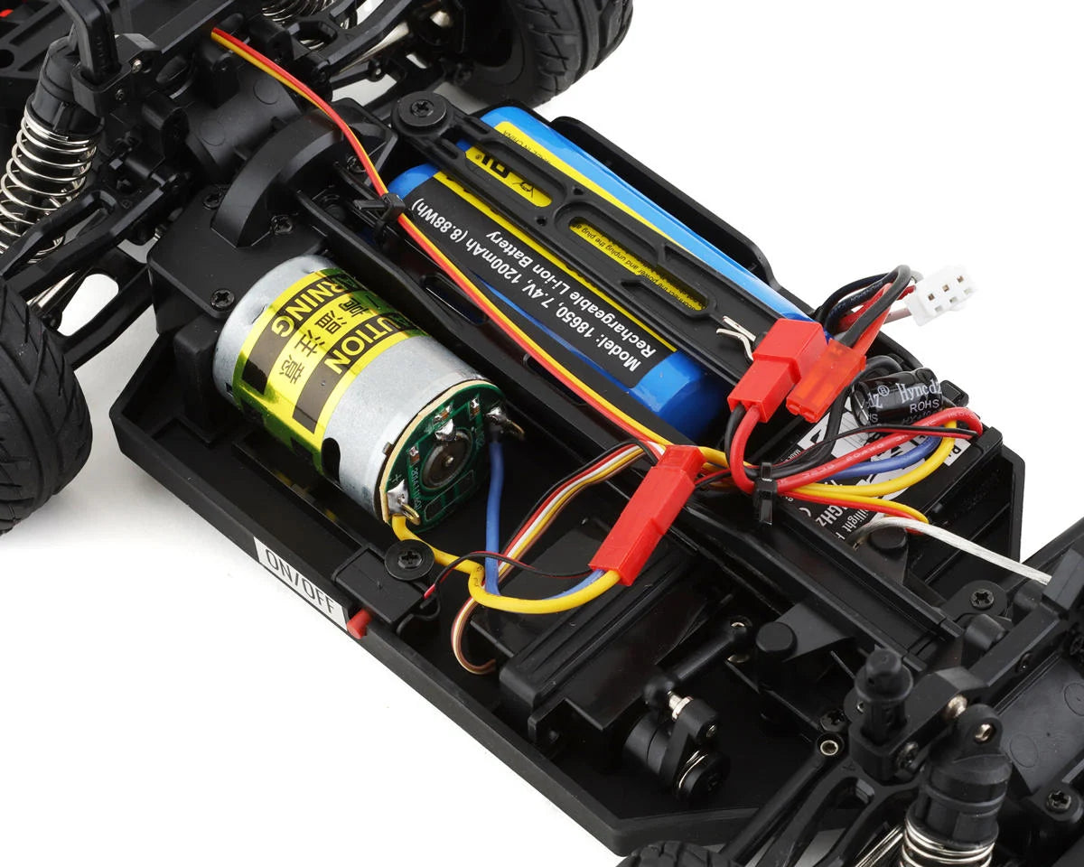 Thanks to the adjustable gyro and racing-inspired wheels and tires, maintaining impeccable control across various terrains becomes a breeze, instilling newfound confidence in beginners to tackle thrilling adventures. Furthermore, the included 2S Li-Ion battery ensures up to 15 minutes of non-stop RC action, providing ample time for beginners to hone their skills and enjoy extended play.