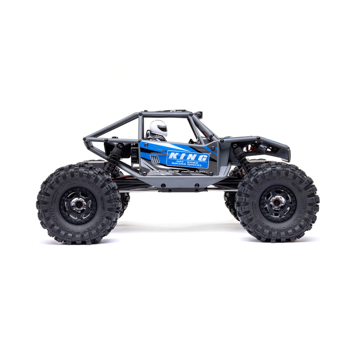 The scaled-down Capra tube chassis adds realistic trail buggy looks, with helmeted driver and passenger figures, LED headlights, rock lights, and light bar. Choose from two new paint scheme and livery options. One has a gray cage and blue body panels with licensed King Shocks livery. The other has a black cage and yellow body panels with licensed Mickey Thompson Tire livery.